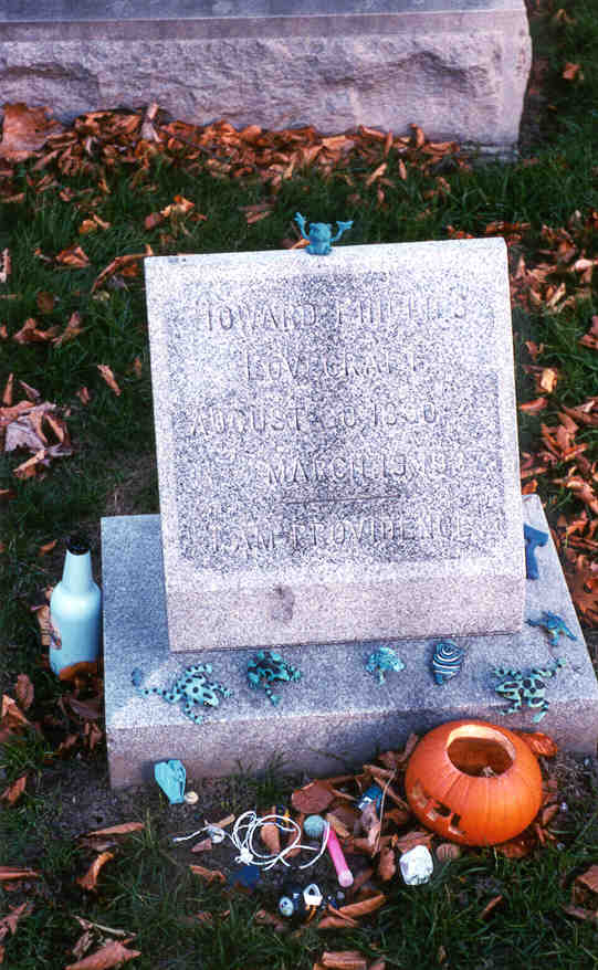 We found out from Paul di Fillippo that Lovecraft was buried in Providence, so we got a taxi and took it to the graveyard where he rests. But it was HUGE! We couldn't find Lovecraft's grave! The cab driver started asking everyone he saw where "H. T. Lovecraft" was buried. We finally corrected him. Eventually we found a homeless guy who knew where the grave was located. He said to the cabbie that he'd show us if the cabbie would split the tip with him. I figured the cab driver wouldn't go for that, and given the cab fare what was a few more bucks? So I told the homeless guy I'd give him five bucks if he'd hop in the cab and take us to the grave. Which he did.