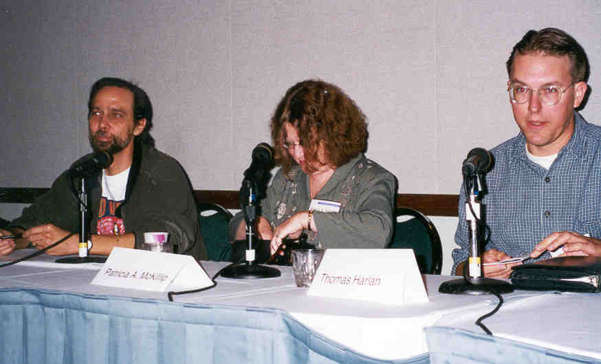 So on to the McKillip stuff, since I pretty much went to meet her (the rest was just bonus.) McKillip was on several panels that I attended. The first one was called "How does the magic work?" and was devoted to whether the author's magic had a consistent logic under it or not. Charles de Lint, Thomas Harlan, J. Gregory Keyes, and Patricia McKillip were on the panel.